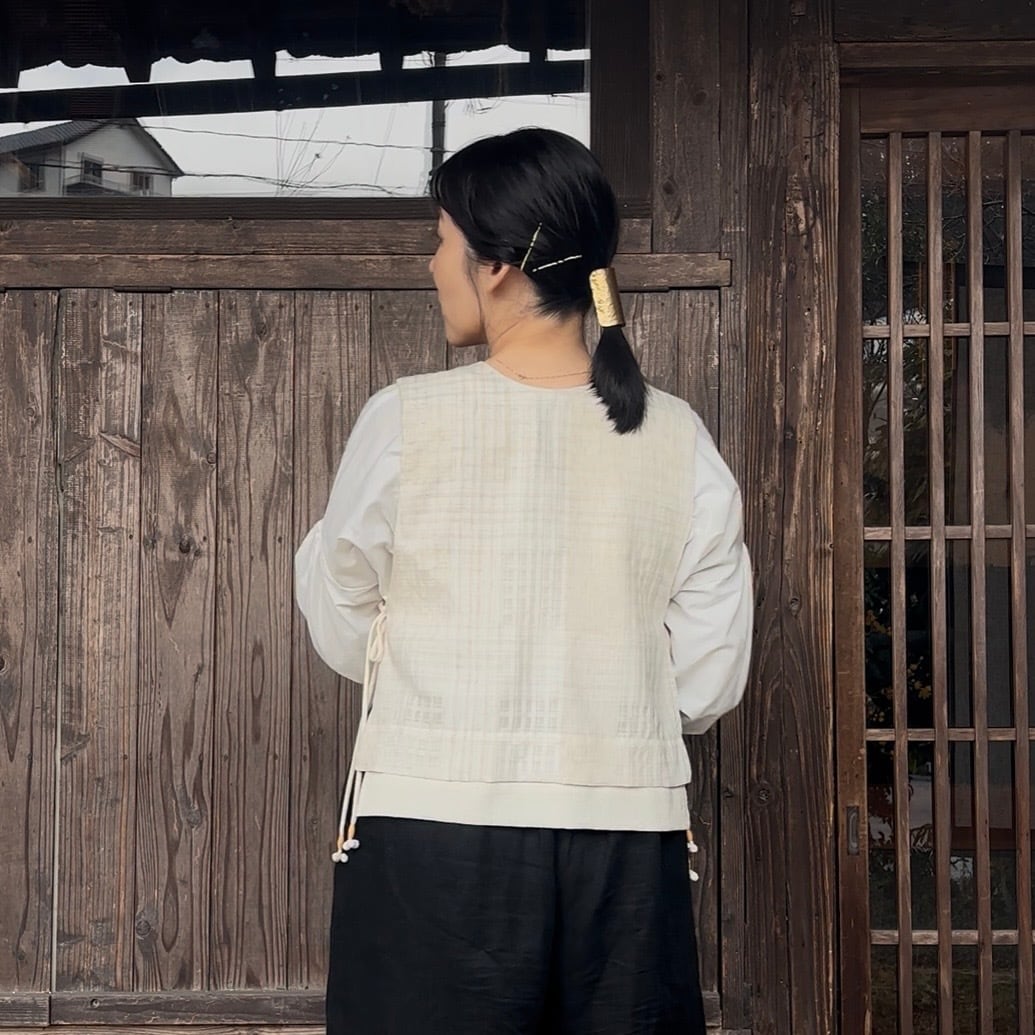 透け感のあるシフォンチェック柄の生地と柔らかくて気持ちよいコットンの2枚仕立てのベストです。